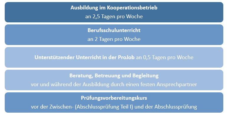 Heißt: Du lernst wie bei einer „normalen“ Ausbildung in einem Betrieb und besuchst die Berufsschule. Dein Ausbildungsvertrag wird jedoch über die ProJob Rheingau-Taunus GmbH abgeschlossen.