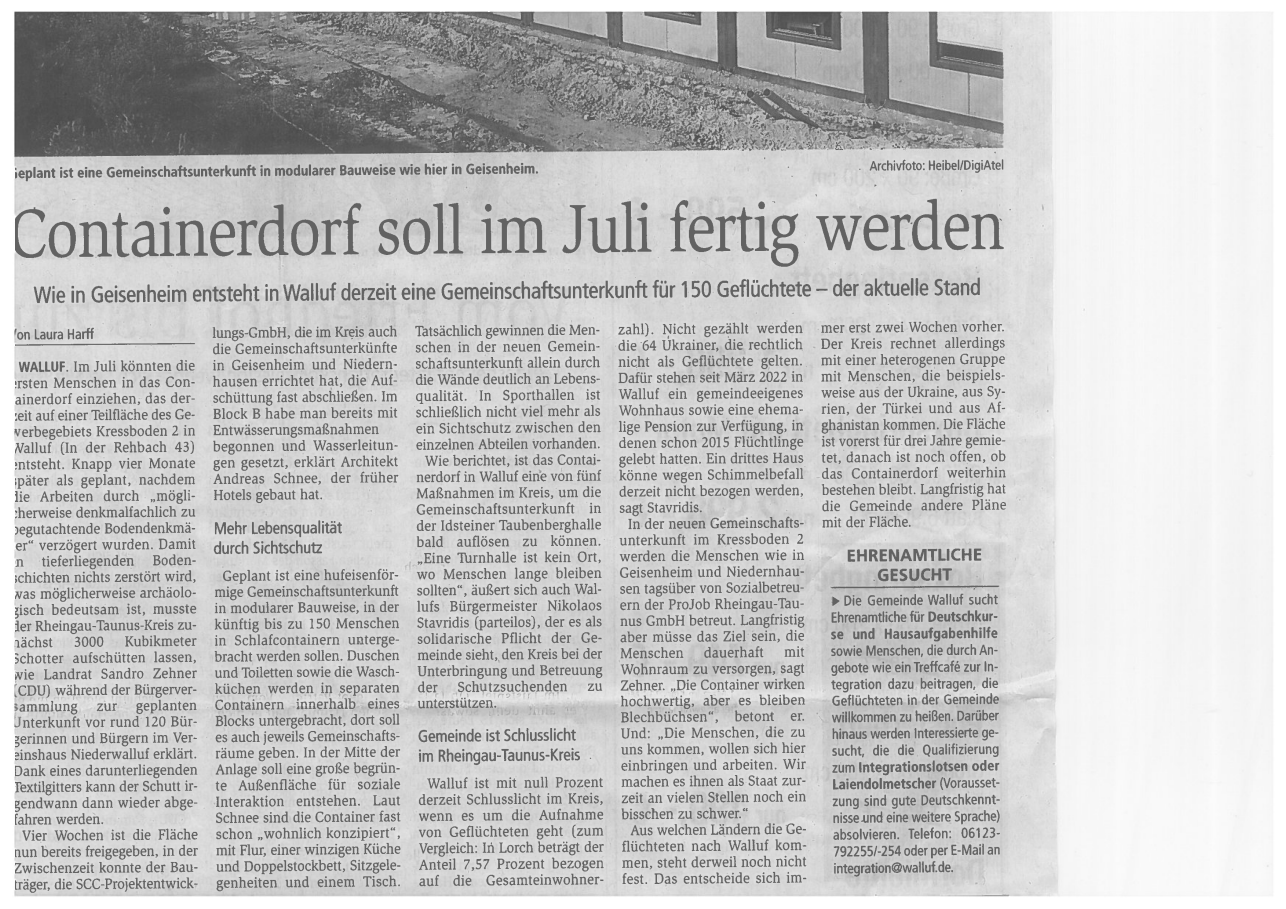 Presseartikel Rheingauer Echo , 21. März 2024 „Containerdorf soll im Juli fertig werden“ :